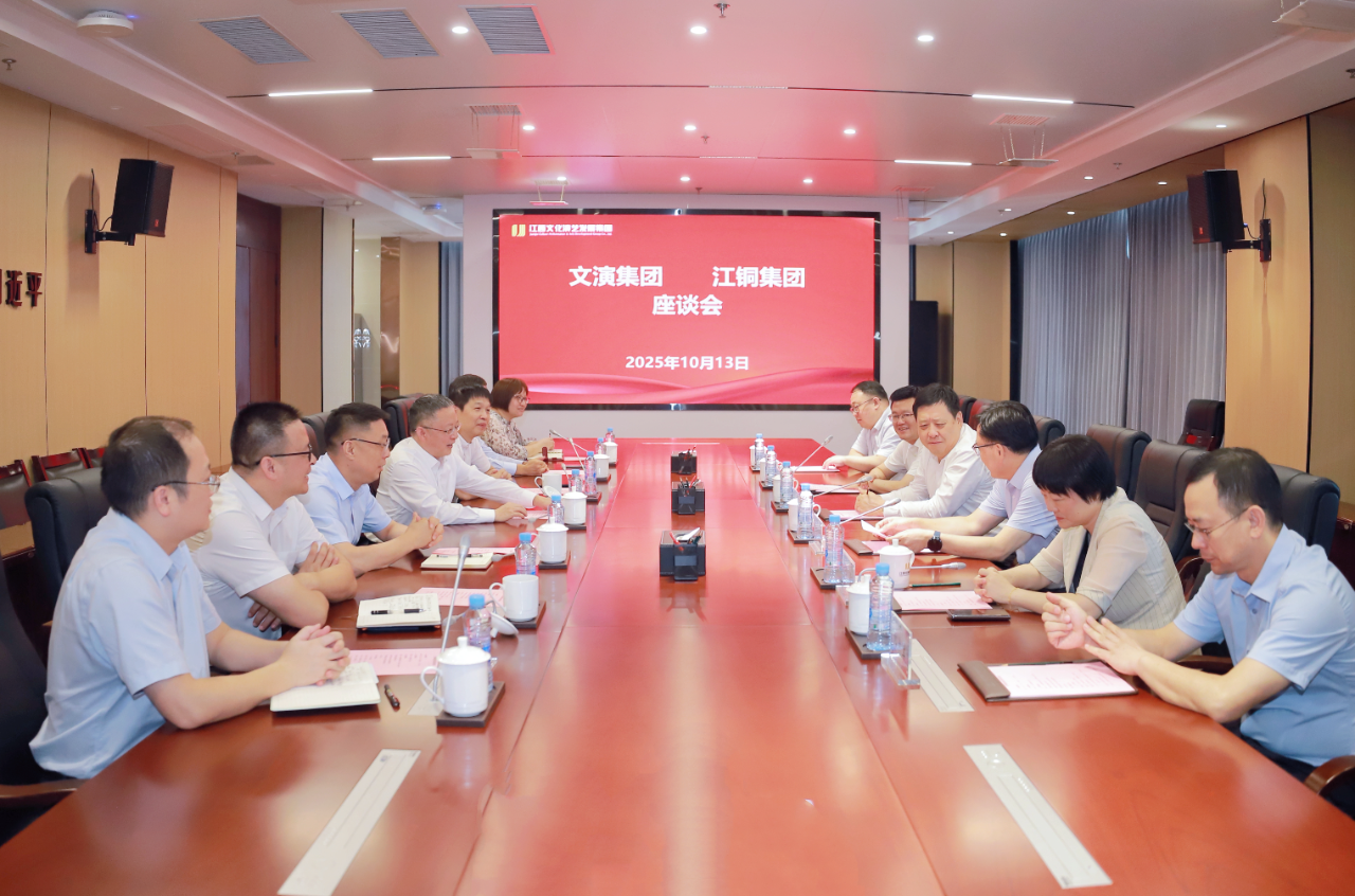 10月13日,江西文演集团党委书记、董事长徐光华,党委副书记、副董事长、总经理李瑞峰会见江铜集团党委书记、董事长郑高清,党委副书记、副董事长、总经理周少兵一行,双方就深化国企战略协作进行深入交流。江铜集团党委副书记缪圣纲,省纪委监委驻江铜纪检监察组组长、江铜集团党委委员、纪委书记王颖;省纪委监委驻文演纪检监察组组长、文演集团党委委员、纪委书记张海峰,文演集团党委委员、董事、财务总监邓力出席。