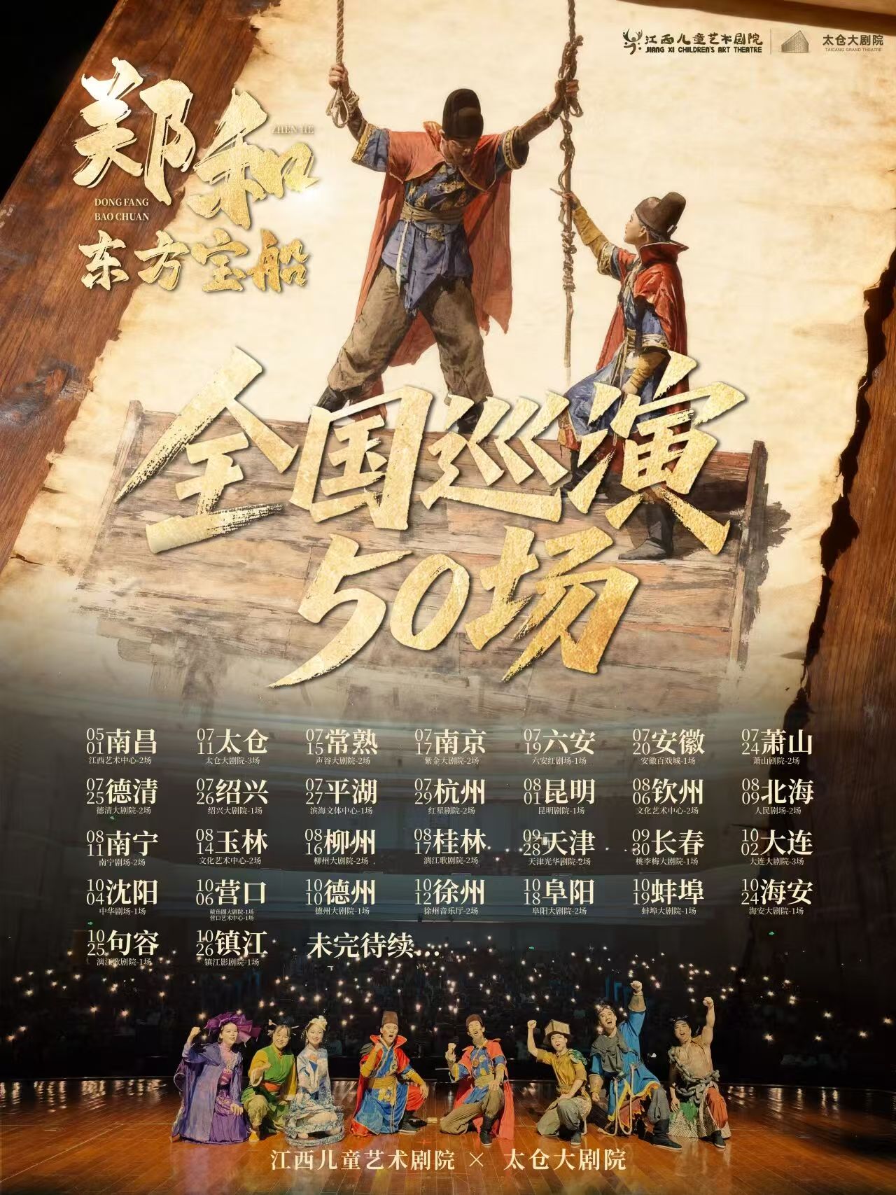 江西儿童艺术剧院与太仓大剧院联合打造的大型原创儿童剧《郑和·东方宝船》7月11日首演,截至10月26日完成50场全城巡演。从盛夏到深秋,演出从赣鄱大地、江南水乡、云贵高原再到东北三省、观众如潮,吸引超5万观众,创下儿童剧单剧巡演场次与上座率双纪录。 50场仅仅只是开始,下一站,这艘承载着文明与希望的“东方宝船”将继续杨帆,未完待续!