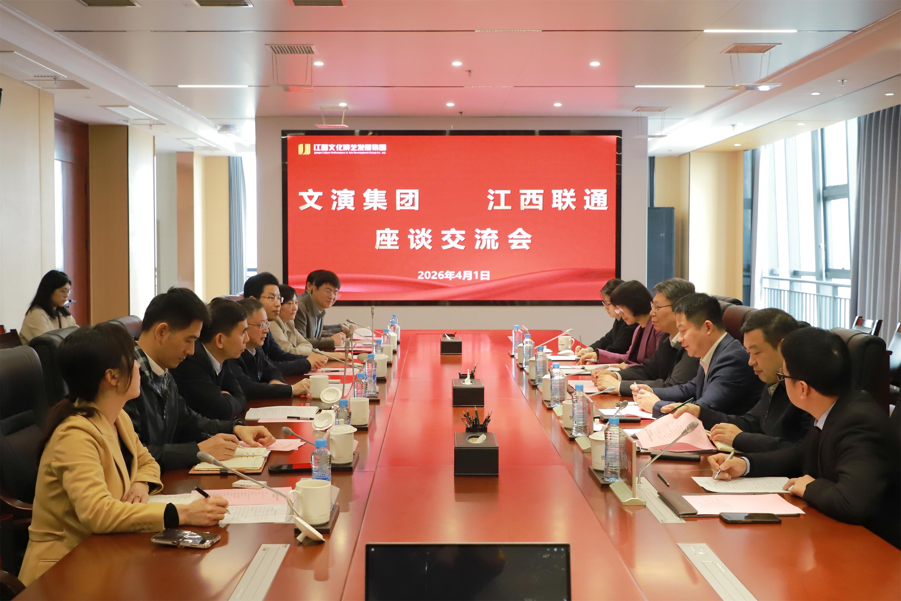 4月1日,中国联通江西省分公司党委书记、总经理张伟率队到访文演集团,与集团党委书记、董事长徐光华就推动文化产业发展下的数字化转型进行深入交流。江西联通党委委员、副总经理樊平;文演集团领导胡志坚、邓力出席。