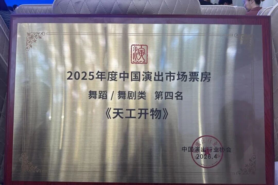近日,中国演出行业协会发布《2025年度中国演出市场票房》榜单,由江西文演集团、北京舞蹈学院共同出品,陆川执导的舞剧《天工开物》荣获舞蹈/舞剧类票房第四名,成功跻身全国前十。